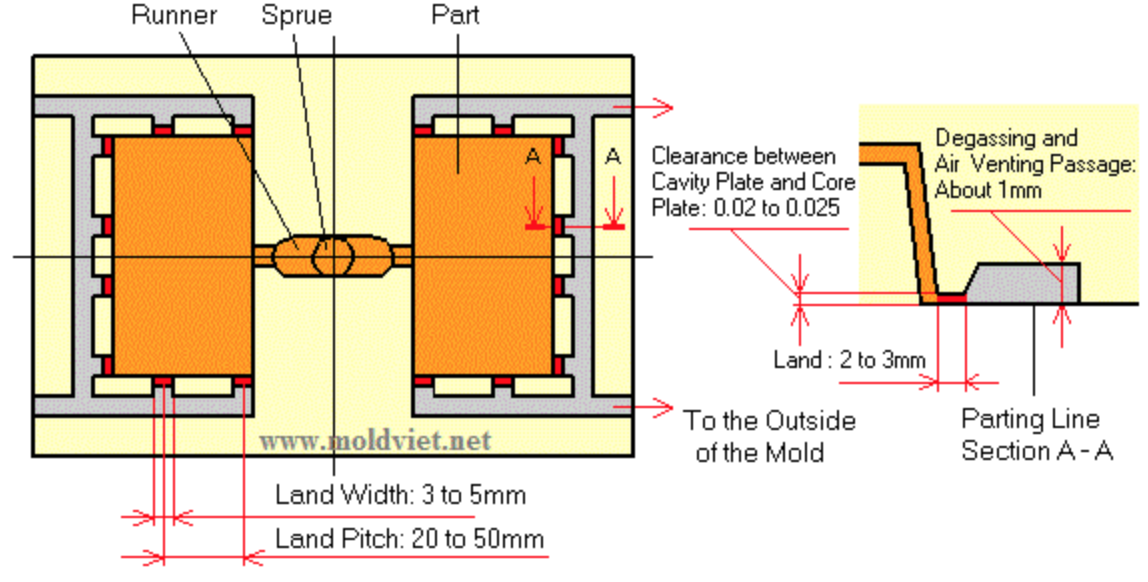 Đường thoát khí thường đường thiết kế các rãnh mỏng trên khuôn, hoặc lỗ trên chốt đẩy khuôn.