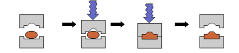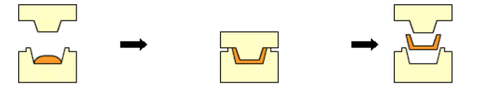 Đóng khuôn trên và sau đó nung nóng khuôn lên và nén khuôn. Sau đó vật liệu sẽ mềm ra và hóa dẻo, điền đầy lòng khuôn.