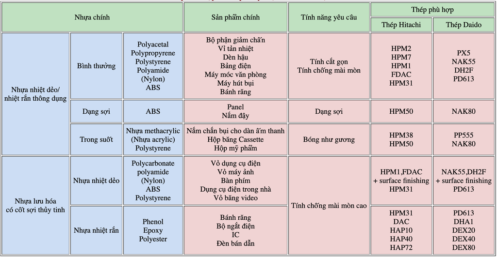 Bảng dưới đây đưa ra các loại thép được sử dụng làm vỏ khuôn, yêu cầu của mỗi loại vật liệu đối với khuôn cũng khác nhau, phụ thuộc vào vật liệu nhựa, độ bóng sản phẩm, chất gia cường, chất độn như sợi thủy tinh trộn lẫn vật liệu nhựa. Quan trọng nhất là tìm được vật liệu thép làm khuôn phù hợp để các yếu tố đạt hiệu quả tốt nhất.